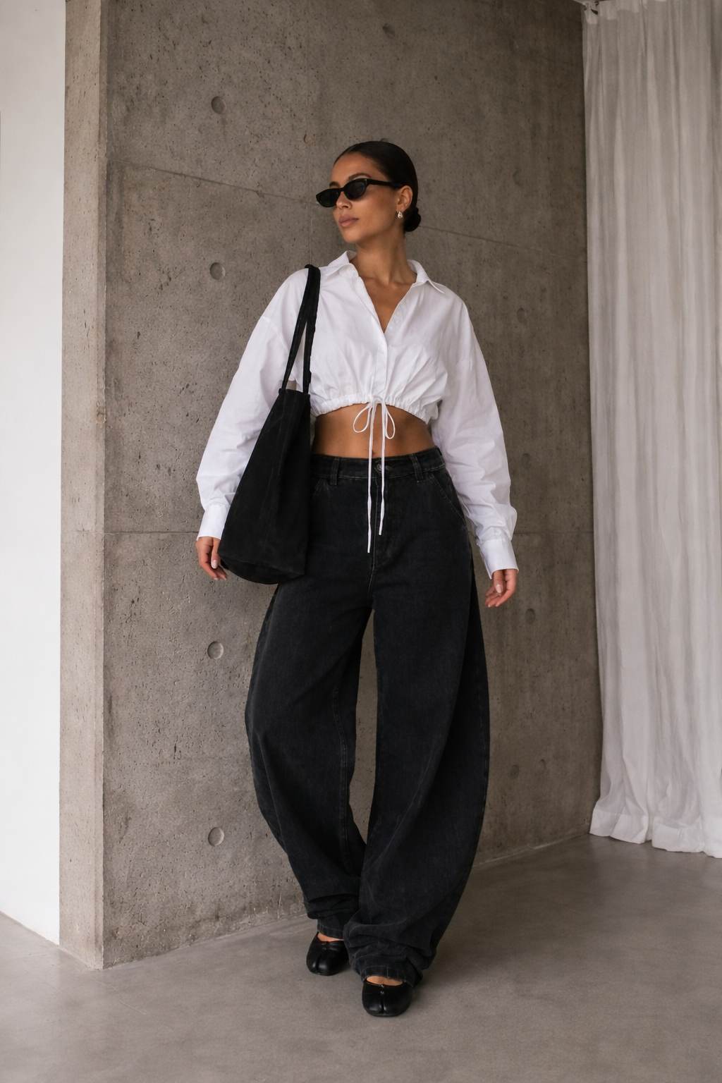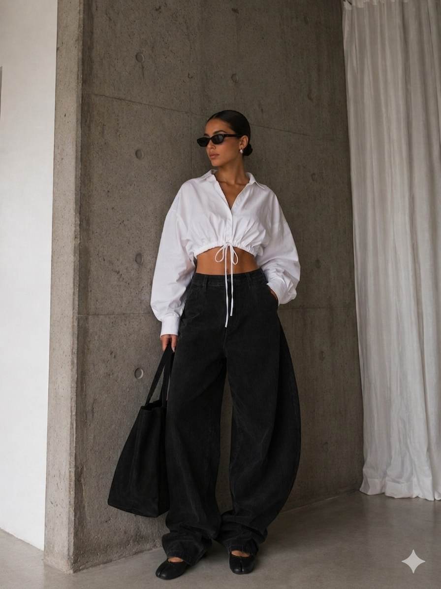 El pantalón barrel redefine la proporción diaria. Su volumen intencionado permite un juego de contrastes: llévelo con prendas superiores entalladas para resaltar la curva de la pierna o con piezas oversize para un look monocromático de vanguardia. Ideal para combinar con calzado de punta fina o mocasines estructurados.