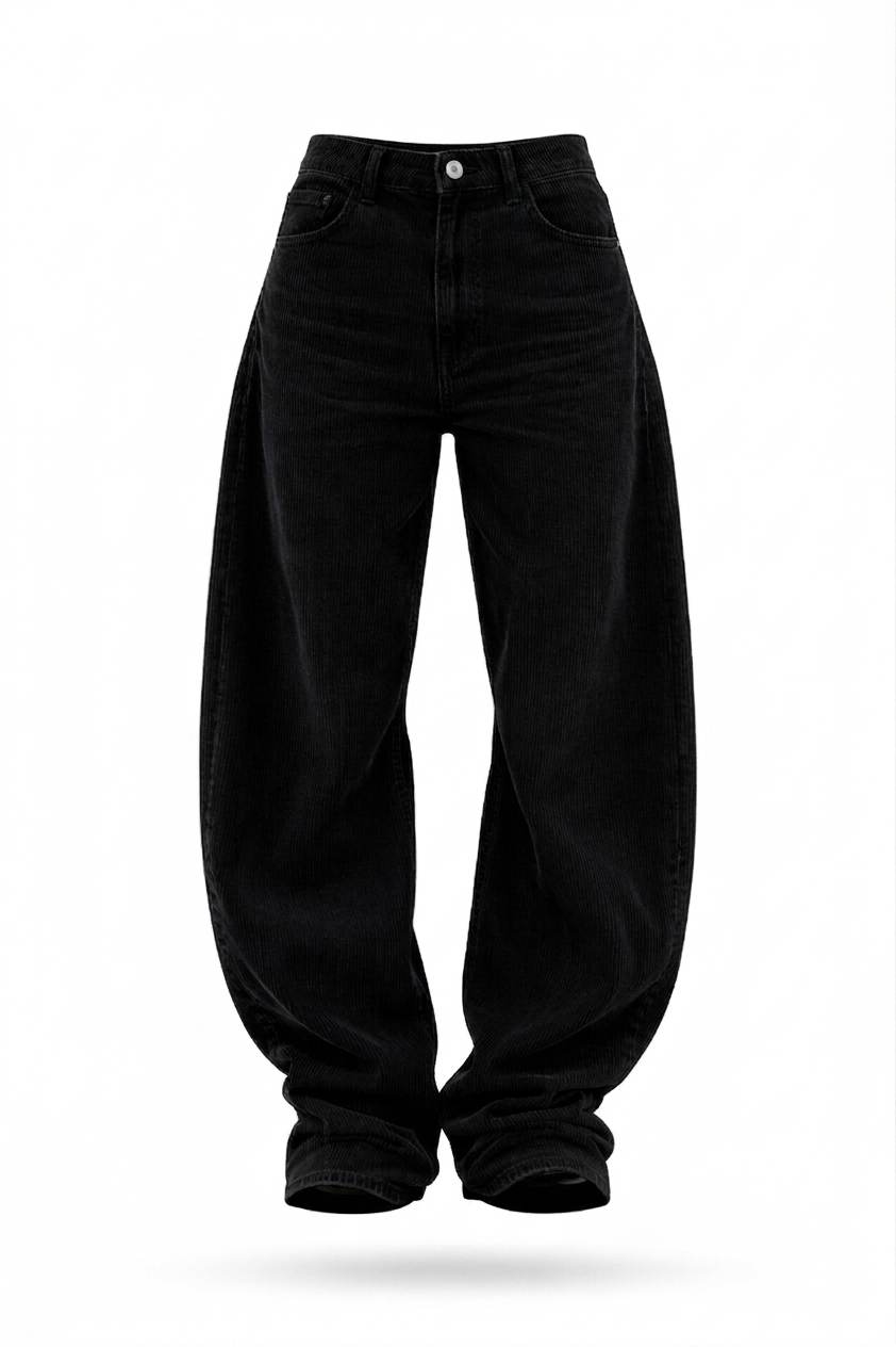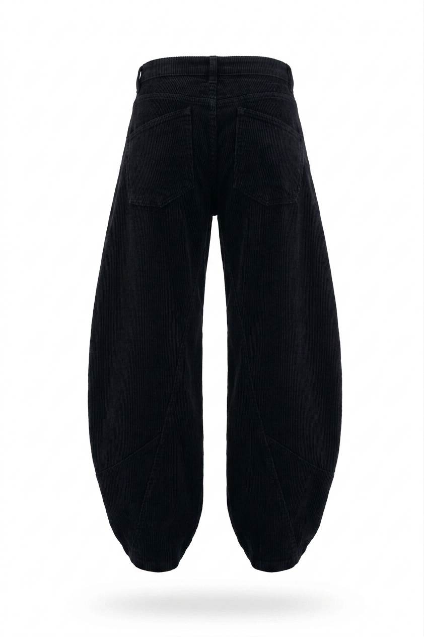 Una exploración de la forma escultórica. Este pantalón se define por su distintiva silueta barrel, con una pierna curva que aporta un volumen arquitectónico y se estrecha sutilmente hacia el bajo. Confeccionado en una pana de algodón de grosor medio, la textura acanalada acentúa la caída y la dimensionalidad de la prenda.