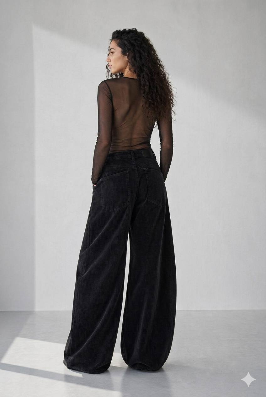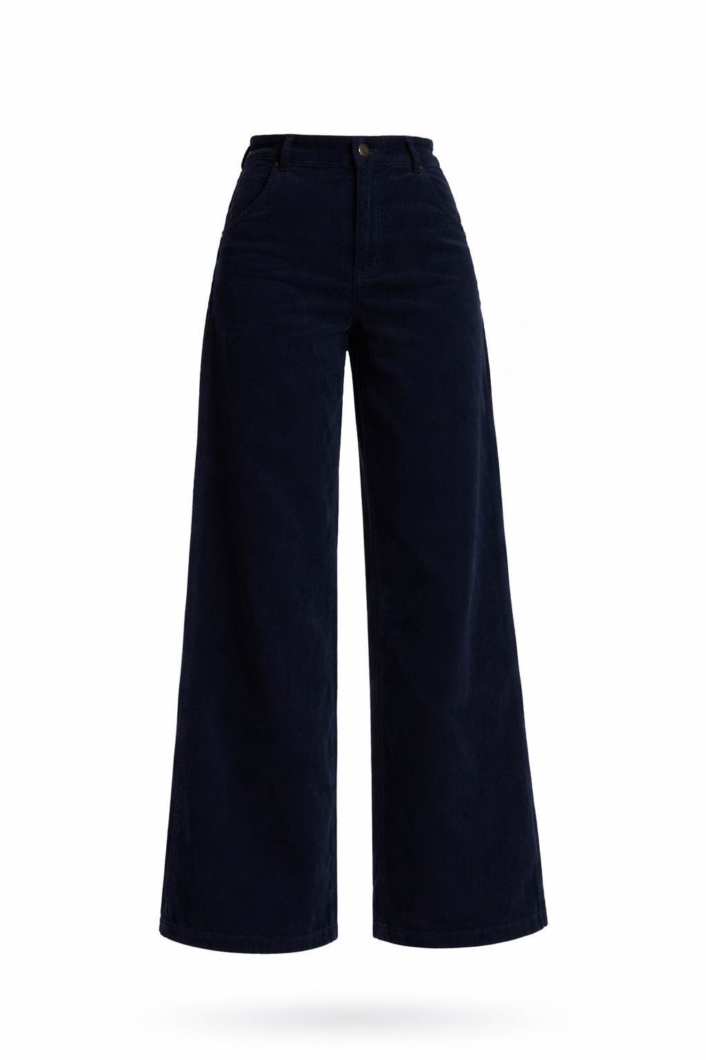 Pantalón de tiro alto confeccionado en pana acanalada de tacto suave y estructura firme. Su silueta se ajusta sutilmente en la cadera y se abre en una caída amplia y limpia hacia el bajo, creando un volumen fluido y sofisticado.